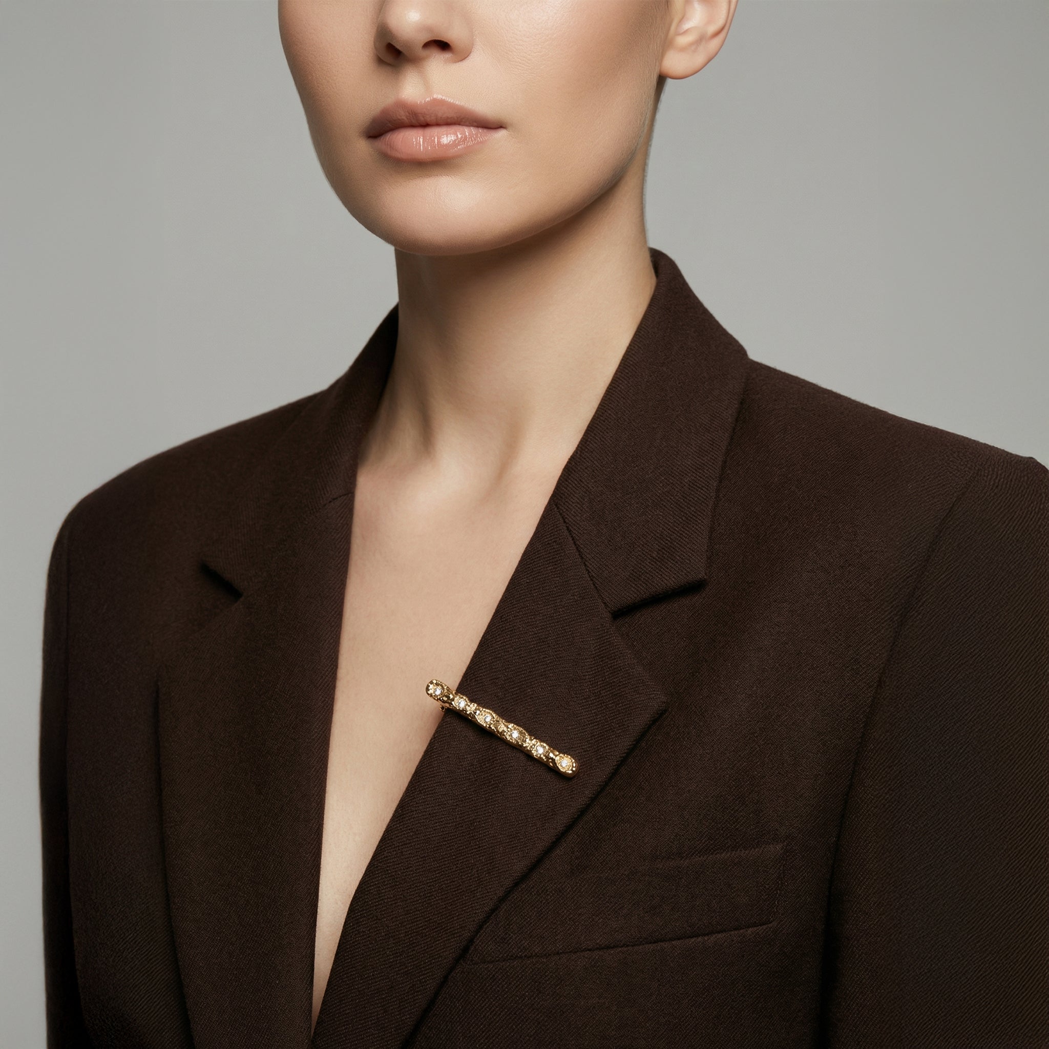 La struttura a molletta la rende estremamente facile da indossare: un accessorio versatile da applicare su giacche, scollature, vestiti monospalla, maglieria… e perché no, anche tra i capelli, per un tocco di luce inaspettato.